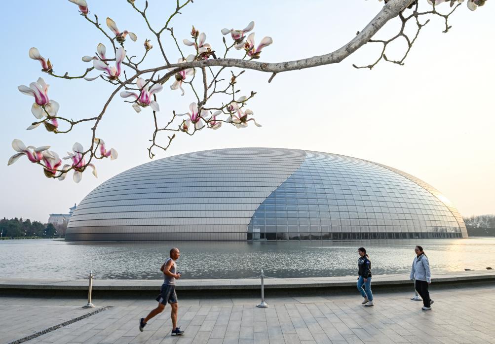 3月12日,市民从国家大剧院旁的玉兰树下经过。